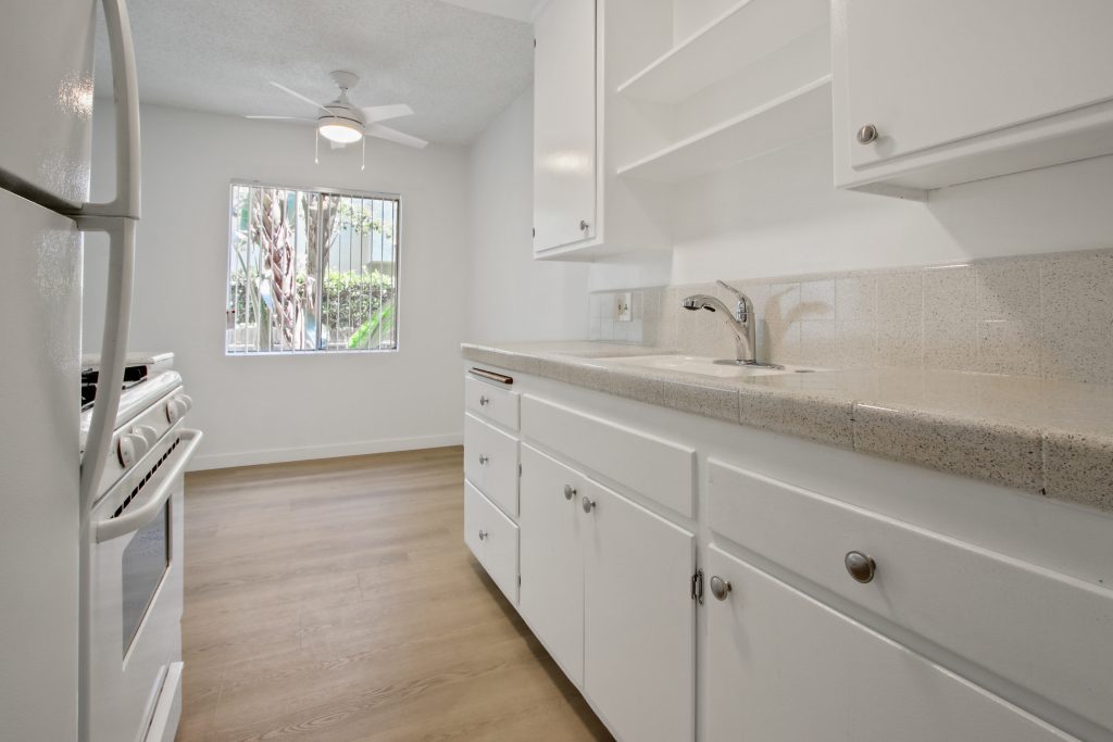 Terrific opportunity to live in a lower 1 bedroom apartment in a lovely, well maintained building in West LA — close to SM Blvd! Terrific value for this location. Features LVT floors, tile counters, and more! Bright!! Must see! And check out the massive community roof deck. Summer is coming! Good closet space. Fridge included. One parking space included. Shared laundry room onsite. Approx. 600 sf.
